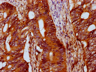 IHC image of CSB-PA887019LA01HU diluted at 1:400 and staining in paraffin-embedded human colon cancer performed on a Leica BondTM system. After dewaxing and hydration, antigen retrieval was mediated by high pressure in a citrate buffer (pH 6.0). Section was blocked with 10% normal goat serum 30min at RT. Then primary antibody (1% BSA) was incubated at 4°C overnight. The primary is detected by a biotinylated secondary antibody and visualized using an HRP conjugated SP system.