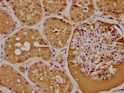 IHC image of CSB-PA846657LA01HU diluted at 1:400 and staining in paraffin-embedded human kidney tissue performed on a Leica BondTM system. After dewaxing and hydration, antigen retrieval was mediated by high pressure in a citrate buffer (pH 6.0). Section was blocked with 10% normal goat serum 30min at RT. Then primary antibody (1% BSA) was incubated at 4°C overnight. The primary is detected by a biotinylated secondary antibody and visualized using an HRP conjugated SP system.
