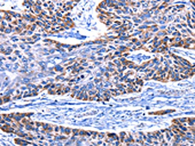 The image on the left is immunohistochemistry of paraffin-embedded Human esophagus cancer tissue using CSB-PA908724(IGF2BP2 Antibody) at dilution 1/15, on the right is treated with fusion protein. (Original magnification: ×200)