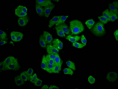 Immunofluorescence staining of HepG2 cells with CSB-PA011340LA01HU at 1:66, counter-stained with DAPI. The cells were fixed in 4% formaldehyde, permeabilized using 0.2% Triton X-100 and blocked in 10% normal Goat Serum. The cells were then incubated with the antibody overnight at 4°C. The secondary antibody was Alexa Fluor 488-congugated AffiniPure Goat Anti-Rabbit IgG(H+L).