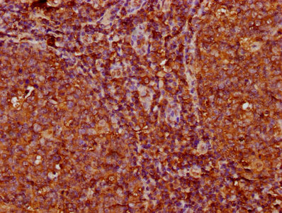 IHC image of CSB-PA011340LA01HU diluted at 1:200 and staining in paraffin-embedded human tonsil tissue performed on a Leica BondTM system. After dewaxing and hydration, antigen retrieval was mediated by high pressure in a citrate buffer (pH 6.0). Section was blocked with 10% normal goat serum 30min at RT. Then primary antibody (1% BSA) was incubated at 4°C overnight. The primary is detected by a biotinylated secondary antibody and visualized using an HRP conjugated SP system.