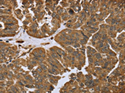 The image on the left is immunohistochemistry of paraffin-embedded Human prostate cancer tissue using CSB-PA240464(IKBIP Antibody) at dilution 1/40, on the right is treated with fusion protein. (Original magnification: ×200)