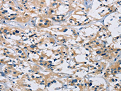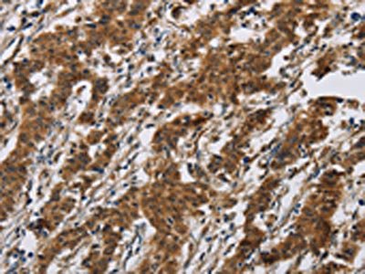The image on the left is immunohistochemistry of paraffin-embedded Human gastic cancer tissue using CSB-PA121041(IL17RB Antibody) at dilution 1/40, on the right is treated with synthetic peptide. (Original magnification: ×200)