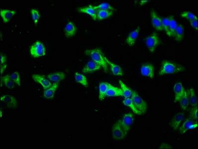 Immunofluorescence staining of HepG2 cells with CSB-PA822717LA01HU at 1:333, counter-stained with DAPI. The cells were fixed in 4% formaldehyde, permeabilized using 0.2% Triton X-100 and blocked in 10% normal Goat Serum. The cells were then incubated with the antibody overnight at 4°C. The secondary antibody was Alexa Fluor 488-congugated AffiniPure Goat Anti-Rabbit IgG(H+L).
