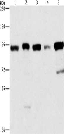 Gel: 6%SDS-PAGE,Lysate: 40 μg,Lane 1-5: Raji cells, 231 cells, HepG2 cells, Hela cells, 293T cells,Primary antibody: CSB-PA985538(IMMT Antibody) at dilution 1/270 dilution,Secondary antibody: Goat anti rabbit IgG at 1/8000 dilution,Exposure time: 5 seconds