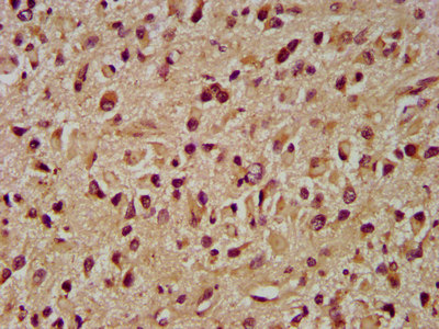 IHC image of CSB-PA011734LA01HU diluted at 1:400 and staining in paraffin-embedded human glioma performed on a Leica BondTM system. After dewaxing and hydration, antigen retrieval was mediated by high pressure in a citrate buffer (pH 6.0). Section was blocked with 10% normal goat serum 30min at RT. Then primary antibody (1% BSA) was incubated at 4°C overnight. The primary is detected by a biotinylated secondary antibody and visualized using an HRP conjugated SP system.