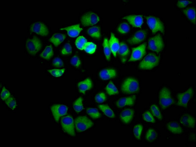 Immunofluorescence staining of Hela cells with CSB-PA873641LA01HU at 1:133, counter-stained with DAPI. The cells were fixed in 4% formaldehyde, permeabilized using 0.2% Triton X-100 and blocked in 10% normal Goat Serum. The cells were then incubated with the antibody overnight at 4°C. The secondary antibody was Alexa Fluor 488-congugated AffiniPure Goat Anti-Rabbit IgG(H+L).