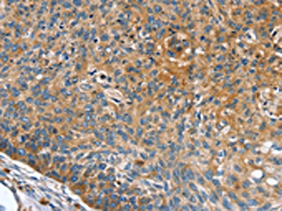 The image on the left is immunohistochemistry of paraffin-embedded Human esophagus cancer tissue using CSB-PA285156(INS Antibody) at dilution 1/35, on the right is treated with synthetic peptide. (Original magnification: ×200)