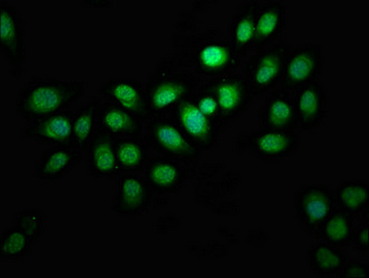 Immunofluorescence staining of A549 cells with CSB-PA011758EA01HU at 1:100, counter-stained with DAPI. The cells were fixed in 4% formaldehyde, permeabilized using 0.2% Triton X-100 and blocked in 10% normal Goat Serum. The cells were then incubated with the antibody overnight at 4°C. The secondary antibody was Alexa Fluor 488-congugated AffiniPure Goat Anti-Rabbit IgG(H+L).