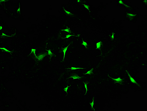 Immunofluorescence staining of U251 cells with CSB-PA011758LA01HU at 1:100, counter-stained with DAPI. The cells were fixed in 4% formaldehyde and blocked in 10% normal Goat Serum. The cells were then incubated with the antibody overnight at 4°C. The secondary antibody was Alexa Fluor 488-congugated AffiniPure Goat Anti-Rabbit IgG(H+L).