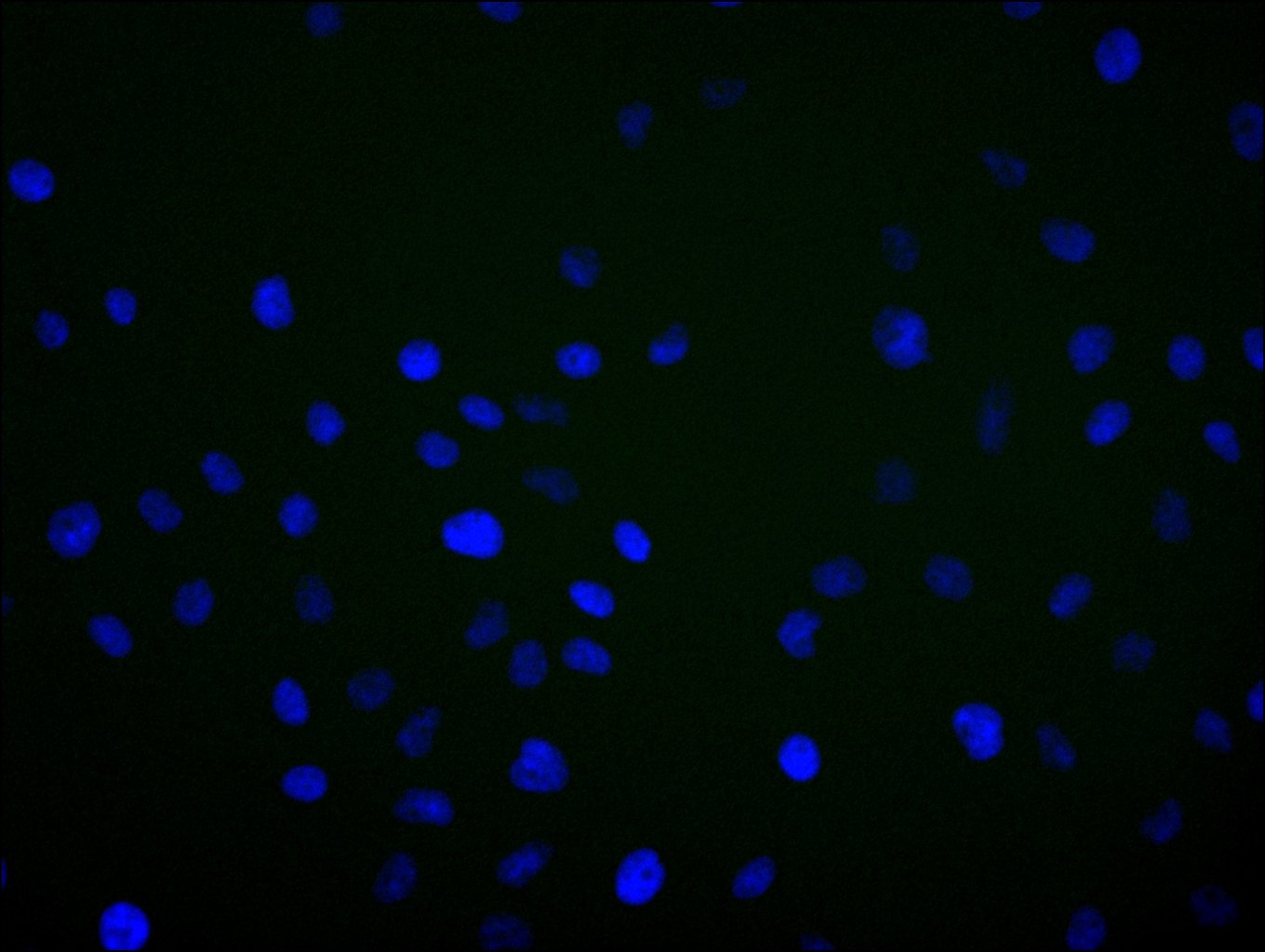 Immunofluorescence staining of Hela cell with 5% goat serum, counter-stained with DAPI. The cells were fixed in 4% formaldehyde and blocked in 10% normal Goat Serum. The cells were then incubated with the antibody overnight at 4C. The secondary antibody was Alexa Fluor 488-congugated AffiniPure Goat Anti-Rabbit IgG(H+L).