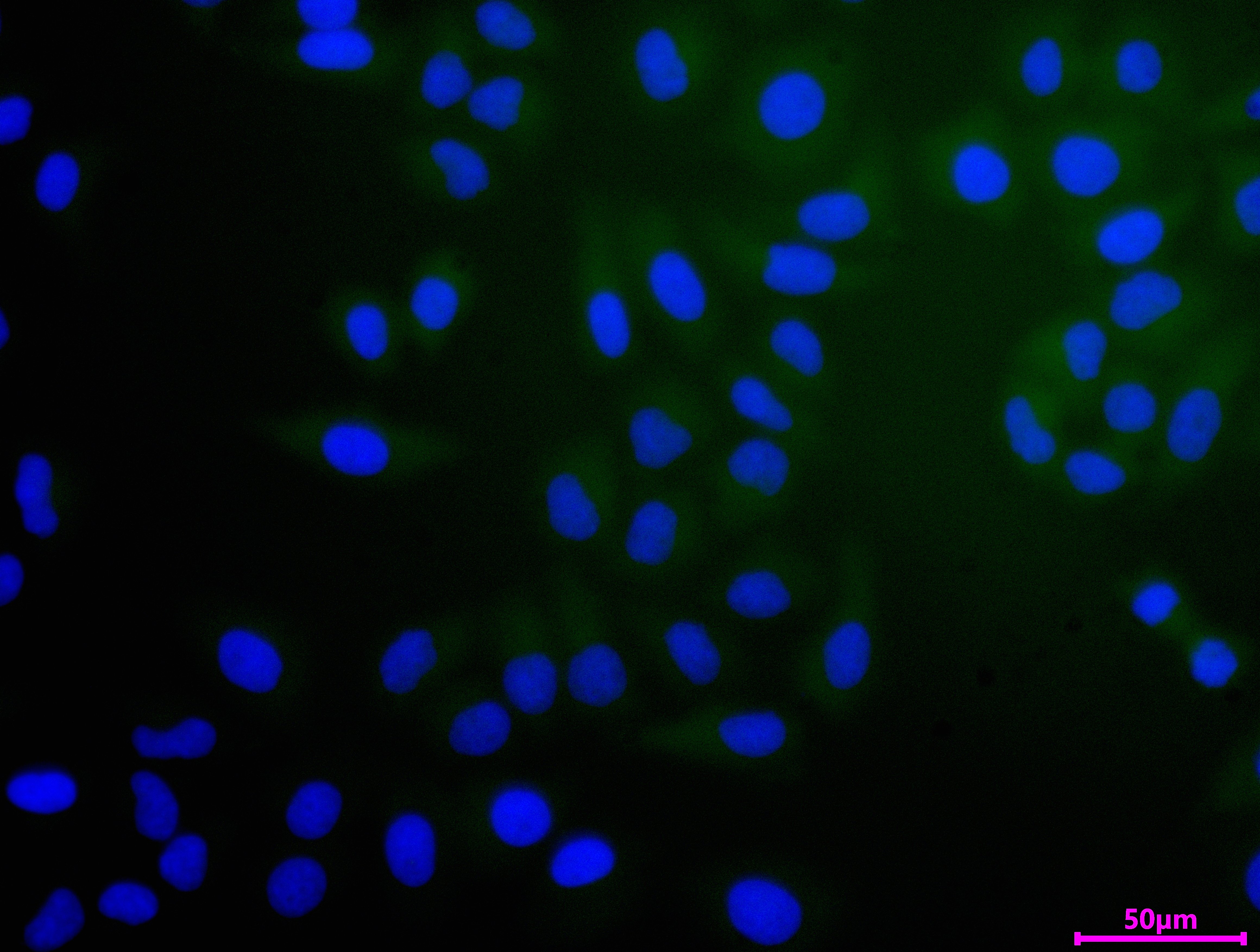 Immunofluorescence staining of Hela cell with CSB-PA011769LA01HU at 1:30, counter-stained with DAPI. The cells were fixed in 4% formaldehyde and and permeated by 0.2% TritonX-100 for 15 min. Then 10% normal goat serum to block non-specific protein-protein interactions . The cells were then incubated with the antibody overnight at 4℃. The secondary antibody was Alexa Fluor 488-congugated AffiniPure Goat Anti-Rabbit IgG(H+L).