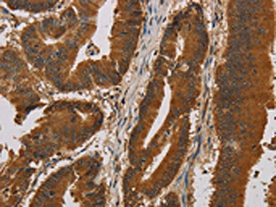 The image on the left is immunohistochemistry of paraffin-embedded Human colon cancer tissue using CSB-PA139485(IPO9 Antibody) at dilution 1/20, on the right is treated with synthetic peptide. (Original magnification: ×200)