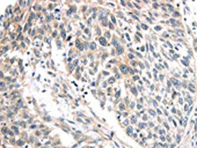The image on the left is immunohistochemistry of paraffin-embedded Human lung cancer tissue using CSB-PA142299(IQGAP2 Antibody) at dilution 1/40, on the right is treated with synthetic peptide. (Original magnification: ×200)