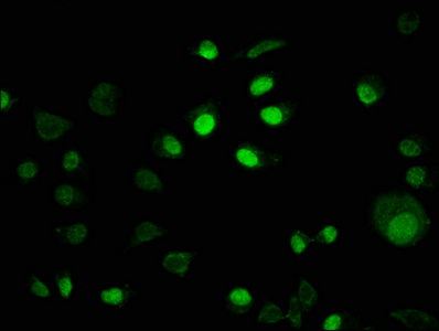 Immunofluorescence staining of MCF-7 cells with CSB-PA011836LA01HU at 1:100, counter-stained with DAPI. The cells were fixed in 4% formaldehyde, permeabilized using 0.2% Triton X-100 and blocked in 10% normal Goat Serum. The cells were then incubated with the antibody overnight at 4°C. The secondary antibody was Alexa Fluor 488-congugated AffiniPure Goat Anti-Rabbit IgG(H+L).