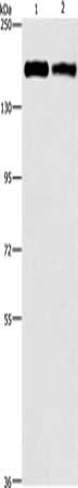 Gel: 6%SDS-PAGE, Lysate: 40 μg, Lane 1-2: Human lung cancer tissue, A431 cells, Primary antibody: CSB-PA938467(ITGA2 Antibody) at dilution 1/300, Secondary antibody: Goat anti rabbit IgG at 1/8000 dilution, Exposure time: 40 seconds