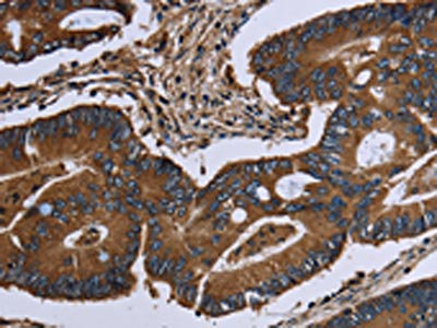 The image on the left is immunohistochemistry of paraffin-embedded Human colon cancer tissue using CSB-PA249653(ITGA2B Antibody) at dilution 1/40, on the right is treated with fusion protein. (Original magnification: ×200)