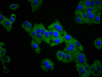 Immunofluorescence staining of HepG2 cells with CSB-PA011866LA01HU at 1:133, counter-stained with DAPI. The cells were fixed in 4% formaldehyde, permeabilized using 0.2% Triton X-100 and blocked in 10% normal Goat Serum. The cells were then incubated with the antibody overnight at 4°C. The secondary antibody was Alexa Fluor 488-congugated AffiniPure Goat Anti-Rabbit IgG(H+L).