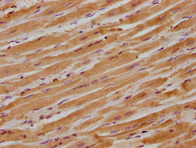 IHC image of CSB-PA011881LA01HU diluted at 1:300 and staining in paraffin-embedded human heart tissue performed on a Leica BondTM system. After dewaxing and hydration, antigen retrieval was mediated by high pressure in a citrate buffer (pH 6.0). Section was blocked with 10% normal goat serum 30min at RT. Then primary antibody (1% BSA) was incubated at 4°C overnight. The primary is detected by a biotinylated secondary antibody and visualized using an HRP conjugated SP system.