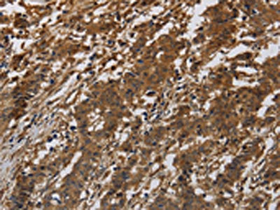 The image on the left is immunohistochemistry of paraffin-embedded Human liver cancer tissue using CSB-PA588701(ITGB7 Antibody) at dilution 1/40, on the right is treated with synthetic peptide. (Original magnification: ×200)