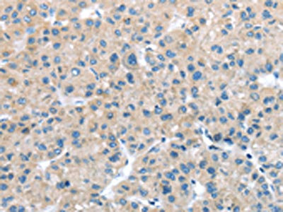 The image on the left is immunohistochemistry of paraffin-embedded Human liver cancer tissue using CSB-PA274847(ITPA Antibody) at dilution 1/25, on the right is treated with fusion protein. (Original magnification: ×200)