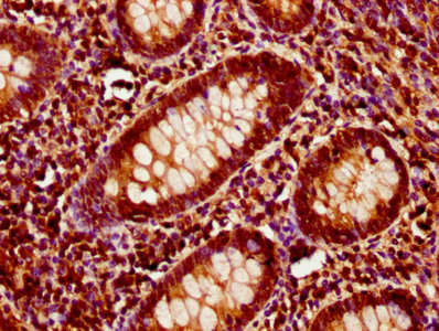 IHC image of CSB-PA621885LA01HU diluted at 1:400 and staining in paraffin-embedded human appendix tissue performed on a Leica BondTM system. After dewaxing and hydration, antigen retrieval was mediated by high pressure in a citrate buffer (pH 6.0). Section was blocked with 10% normal goat serum 30min at RT. Then primary antibody (1% BSA) was incubated at 4°C overnight. The primary is detected by a biotinylated secondary antibody and visualized using an HRP conjugated SP system.