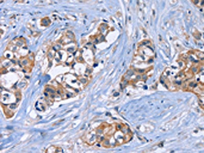 The image on the left is immunohistochemistry of paraffin-embedded Human breast cancer tissue using CSB-PA969766(JAG1 Antibody) at dilution 1/20, on the right is treated with synthetic peptide. (Original magnification: ×200)