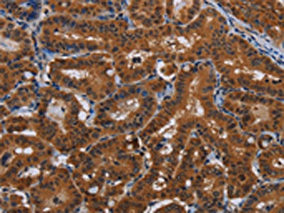 The image on the left is immunohistochemistry of paraffin-embedded Human thyroid cancer tissue using CSB-PA991655(JMJD7 Antibody) at dilution 1/20, on the right is treated with fusion protein. (Original magnification: ×200)