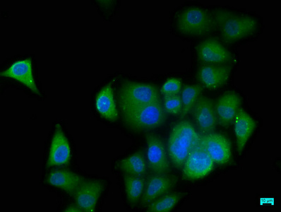 Immunofluorescence staining of Hela cells with CSB-PA011981LA01HU at 1:50, counter-stained with DAPI. The cells were fixed in 4% formaldehyde, permeabilized using 0.2% Triton X-100 and blocked in 10% normal Goat Serum. The cells were then incubated with the antibody overnight at 4°C. The secondary antibody was Alexa Fluor 488-congugated AffiniPure Goat Anti-Rabbit IgG(H+L).