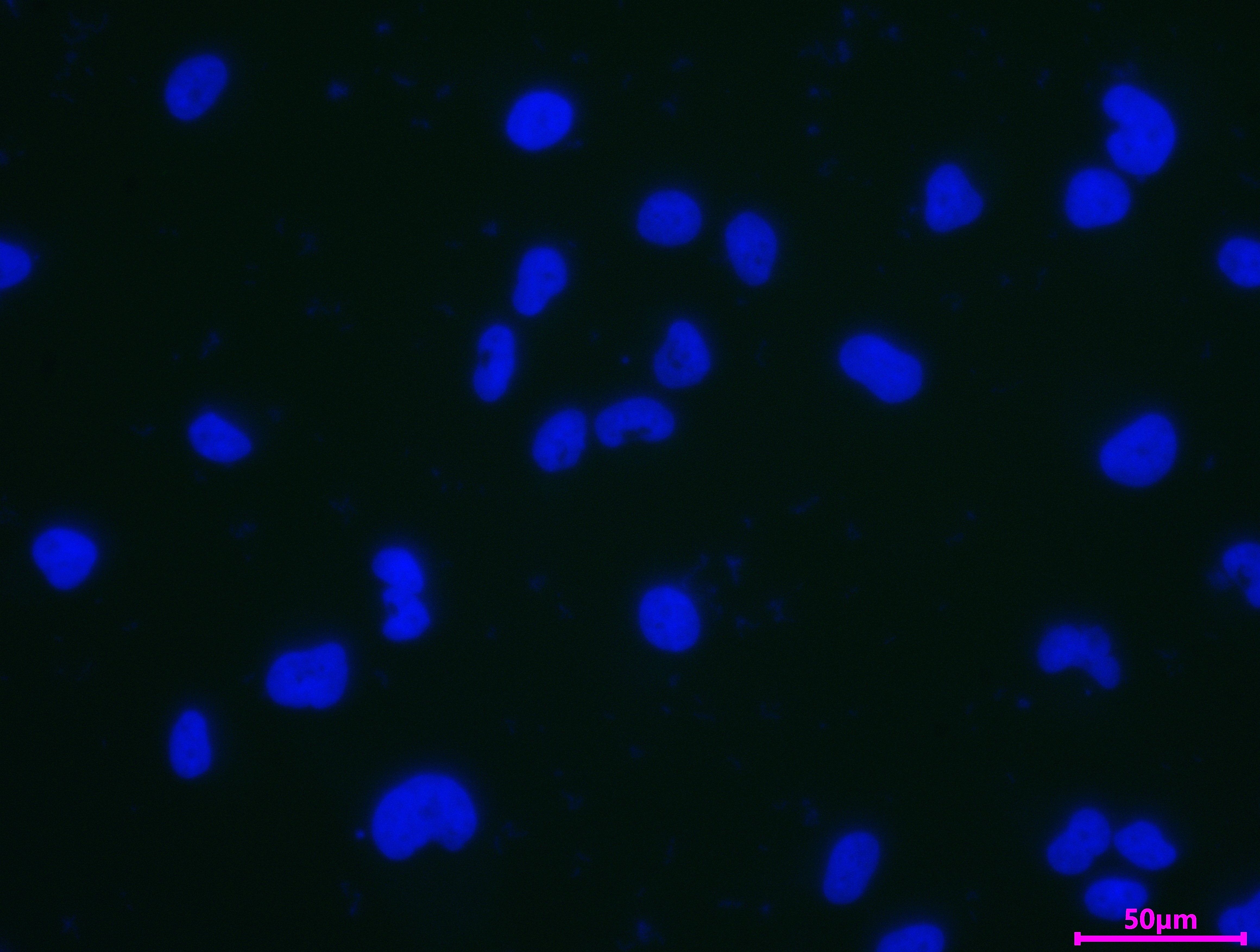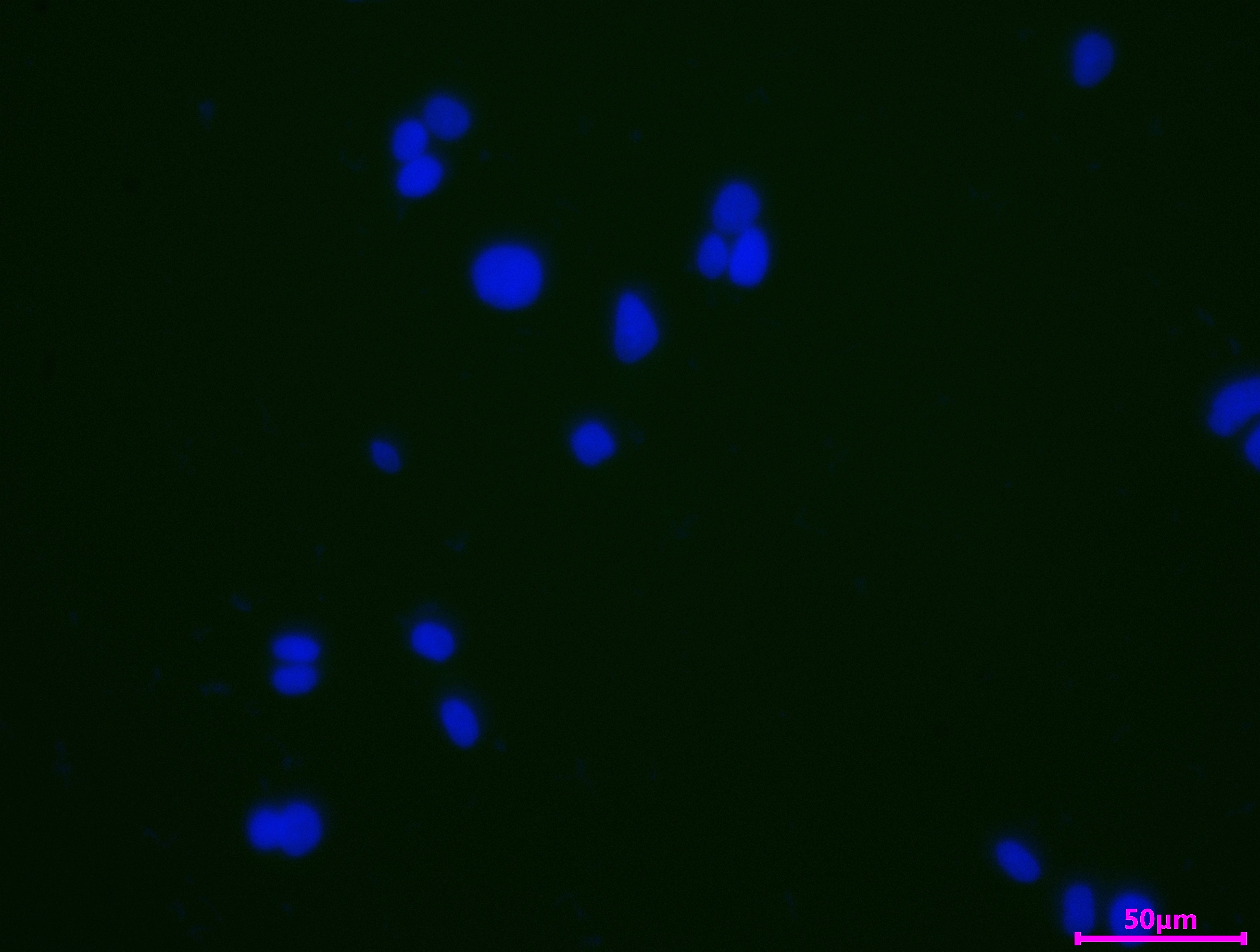Immunofluorescence staining of HepG2 cell with 5% goat serum, counter-stained with DAPI. The cells were fixed in 4% formaldehyde and blocked in 10% normal Goat Serum. The cells were then incubated with the antibody overnight at 4C. The secondary antibody was Alexa Fluor 488-congugated AffiniPure Goat Anti-Rabbit IgG(H+L).