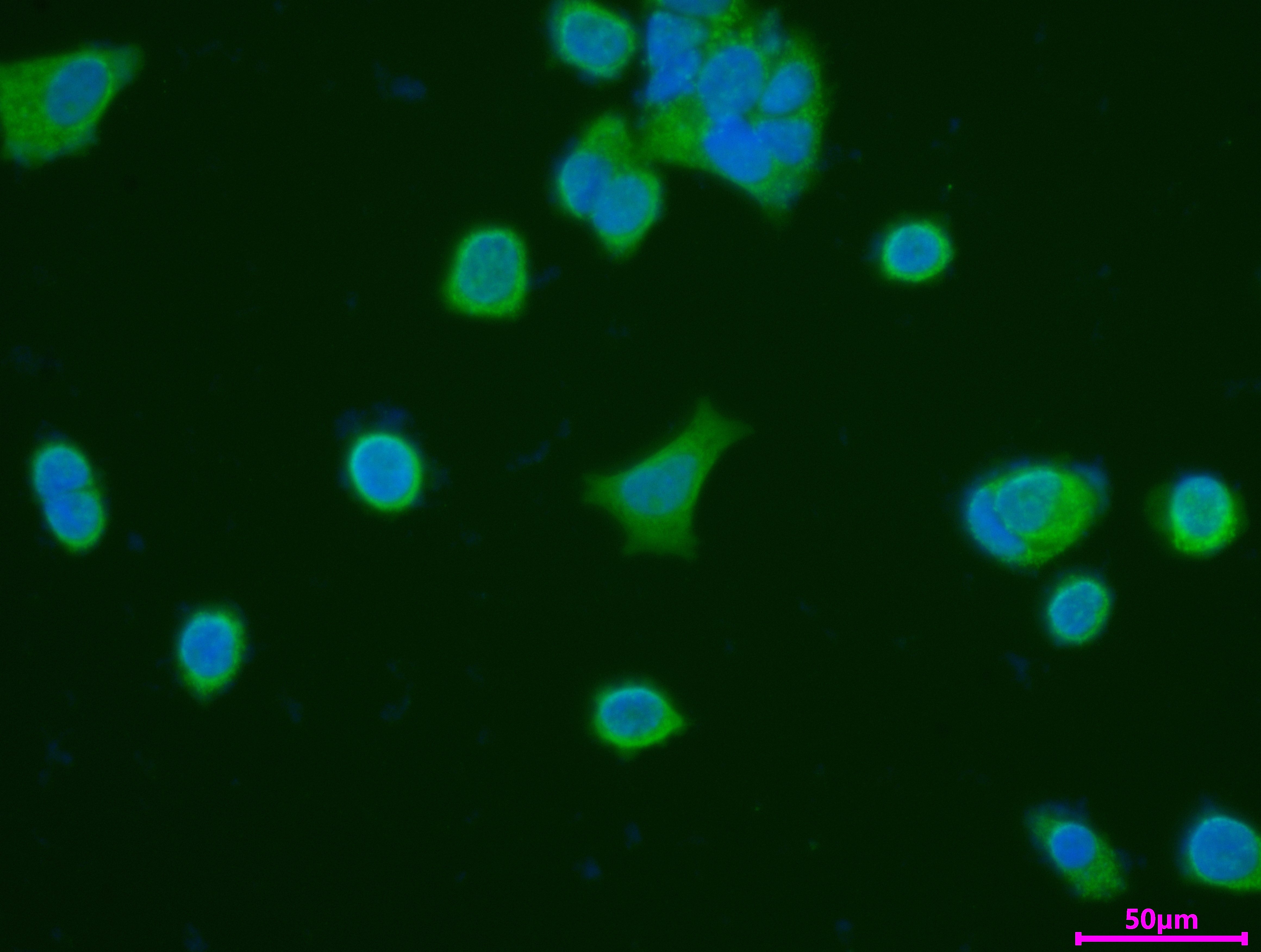 Immunofluorescence staining of MCF-7 cell with CSB-PA17859A0Rb at 1:15, counter-stained with DAPI. The cells were fixed in 4% formaldehyde and and permeated by 0.2% TritonX-100 for 15 min. Then 10% normal goat serum to block non-specific protein-protein interactions . The cells were then incubated with the antibody overnight at 4℃. The secondary antibody was Alexa Fluor 488-congugated AffiniPure Goat Anti-Rabbit IgG(H+L).