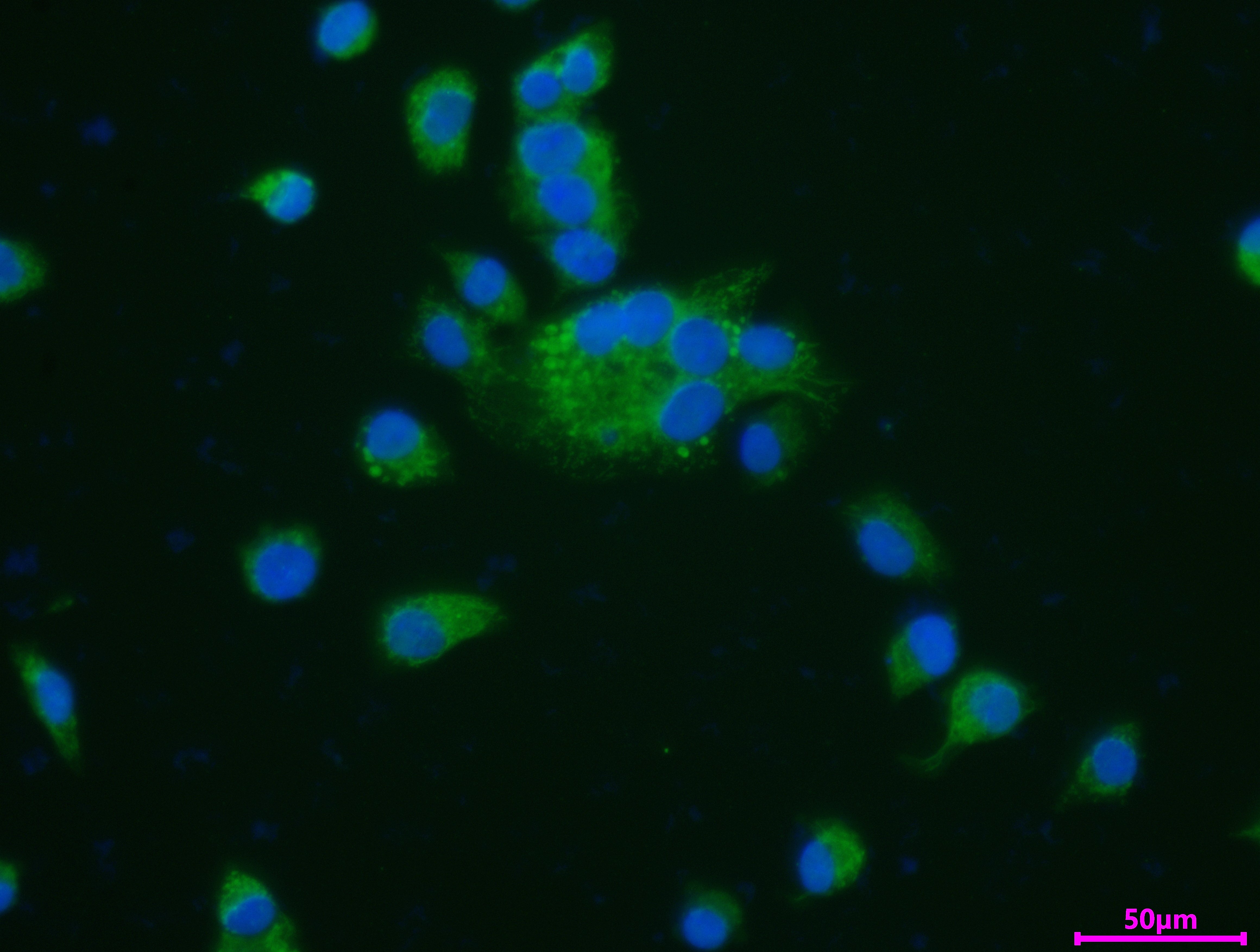 Immunofluorescence staining of HepG2 cell with CSB-PA17859A0Rb at 1:15, counter-stained with DAPI. The cells were fixed in 4% formaldehyde and and permeated by 0.2% TritonX-100 for 15 min. Then 10% normal goat serum to block non-specific protein-protein interactions . The cells were then incubated with the antibody overnight at 4℃. The secondary antibody was Alexa Fluor 488-congugated AffiniPure Goat Anti-Rabbit IgG(H+L).