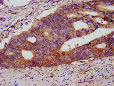 IHC image of CSB-PA873718LA01HU diluted at 1:500 and staining in paraffin-embedded human colon cancer performed on a Leica BondTM system. After dewaxing and hydration, antigen retrieval was mediated by high pressure in a citrate buffer (pH 6.0). Section was blocked with 10% normal goat serum 30min at RT. Then primary antibody (1% BSA) was incubated at 4°C overnight. The primary is detected by a biotinylated secondary antibody and visualized using an HRP conjugated SP system.