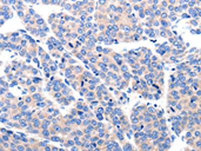 The image on the left is immunohistochemistry of paraffin-embedded Human liver cancer tissue using CSB-PA187759(KCNH8 Antibody) at dilution 1/50, on the right is treated with synthetic peptide. (Original magnification: ×200)