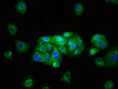 Immunofluorescence staining of HepG2 cells with CSB-PA012048LA01HU at 1:133, counter-stained with DAPI. The cells were fixed in 4% formaldehyde, permeabilized using 0.2% Triton X-100 and blocked in 10% normal Goat Serum. The cells were then incubated with the antibody overnight at 4°C. The secondary antibody was Alexa Fluor 488-congugated AffiniPure Goat Anti-Rabbit IgG(H+L).