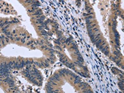 The image on the left is immunohistochemistry of paraffin-embedded Human colon cancer tissue using CSB-PA746124(KCNJ11 Antibody) at dilution 1/40, on the right is treated with fusion protein. (Original magnification: ×200)