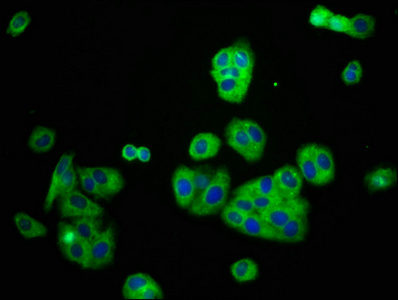 Immunofluorescence staining of HepG2 cells with CSB-PA613604LA01HU at 1:166, counter-stained with DAPI. The cells were fixed in 4% formaldehyde, permeabilized using 0.2% Triton X-100 and blocked in 10% normal Goat Serum. The cells were then incubated with the antibody overnight at 4°C. The secondary antibody was Alexa Fluor 488-congugated AffiniPure Goat Anti-Rabbit IgG(H+L).