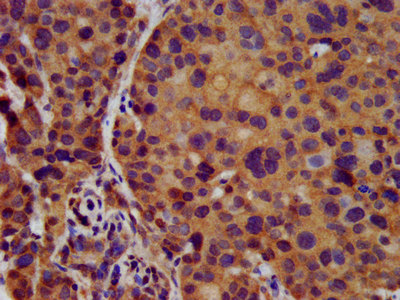 IHC image of CSB-PA613604LA01HU diluted at 1:500 and staining in paraffin-embedded human pancreatic cancer performed on a Leica BondTM system. After dewaxing and hydration, antigen retrieval was mediated by high pressure in a citrate buffer (pH 6.0). Section was blocked with 10% normal goat serum 30min at RT. Then primary antibody (1% BSA) was incubated at 4°C overnight. The primary is detected by a biotinylated secondary antibody and visualized using an HRP conjugated SP system.