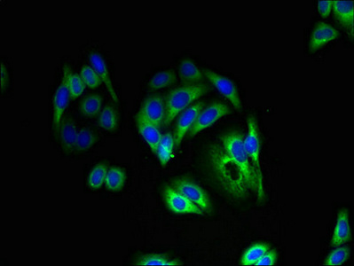 Immunofluorescent analysis of HepG2 cells using CSB-PA862058LA01HU at dilution of 1:100 and Alexa Fluor 488-congugated AffiniPure Goat Anti-Rabbit IgG(H+L)