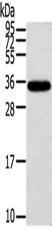 Gel: 12%SDS-PAGE, Lysate: 40 μg, Lane: Mouse brain tissue, Primary antibody: CSB-PA140706(KCNMB3 Antibody) at dilution 1/300, Secondary antibody: Goat anti rabbit IgG at 1/8000 dilution, Exposure time: 5 seconds