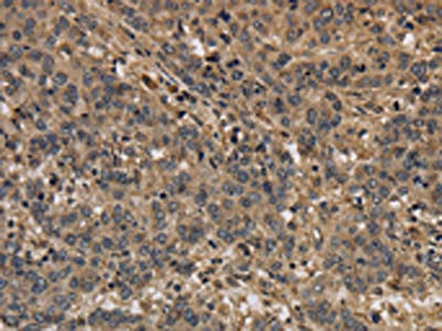 The image on the left is immunohistochemistry of paraffin-embedded Human liver cancer tissue using CSB-PA980762(KCNN4 Antibody) at dilution 1/40, on the right is treated with synthetic peptide. (Original magnification: ×200)