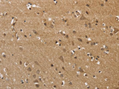 The image on the left is immunohistochemistry of paraffin-embedded Human brain tissue using CSB-PA980762(KCNN4 Antibody) at dilution 1/40, on the right is treated with synthetic peptide. (Original magnification: ×200)