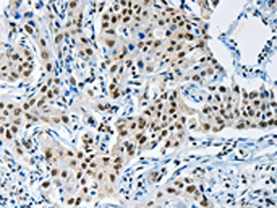 The image on the left is immunohistochemistry of paraffin-embedded Human lung cancer tissue using CSB-PA236497(KDM1A Antibody) at dilution 1/55, on the right is treated with synthetic peptide. (Original magnification: ×200)