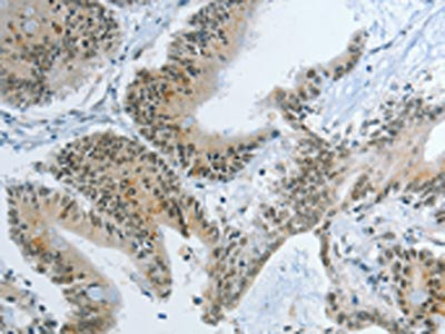 The image on the left is immunohistochemistry of paraffin-embedded Human colon cancer tissue using CSB-PA236497(KDM1A Antibody) at dilution 1/55, on the right is treated with synthetic peptide. (Original magnification: ×200)