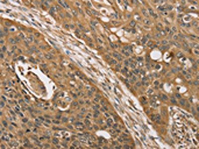 The image on the left is immunohistochemistry of paraffin-embedded Human esophagus cancer tissue using CSB-PA779455(KDM5A Antibody) at dilution 1/45, on the right is treated with synthetic peptide. (Original magnification: ×200)