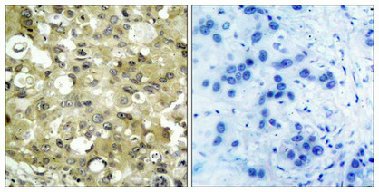 Immunohistochemical analysis of paraffin-embedded human breast carcinoma tissue using VEGFR2(Ab-951) Antibody(left) or the same antibody preincubated with blocking peptide(right).