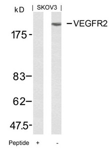 Western blot analysis of extracts from SKOV3 cells using VEGFR2(Ab-951) Antibody and the same antibody preincubated with blocking peptide.