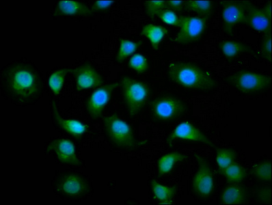 Immunofluorescence staining of A549 cells with CSB-PA012337LA01HU at 1:200, counter-stained with DAPI. The cells were fixed in 4% formaldehyde, permeabilized using 0.2% Triton X-100 and blocked in 10% normal Goat Serum. The cells were then incubated with the antibody overnight at 4°C. The secondary antibody was Alexa Fluor 488-congugated AffiniPure Goat Anti-Rabbit IgG(H+L).