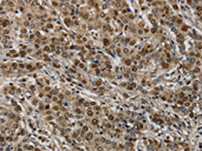 The image on the left is immunohistochemistry of paraffin-embedded Human liver cancer tissue using CSB-PA068103(KIF4A Antibody) at dilution 1/40, on the right is treated with synthetic peptide. (Original magnification: ×200)