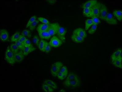 Immunofluorescence staining of HepG2 cells with CSB-PA614817LA01HU at 1:100, counter-stained with DAPI. The cells were fixed in 4% formaldehyde, permeabilized using 0.2% Triton X-100 and blocked in 10% normal Goat Serum. The cells were then incubated with the antibody overnight at 4°C. The secondary antibody was Alexa Fluor 488-congugated AffiniPure Goat Anti-Rabbit IgG(H+L).
